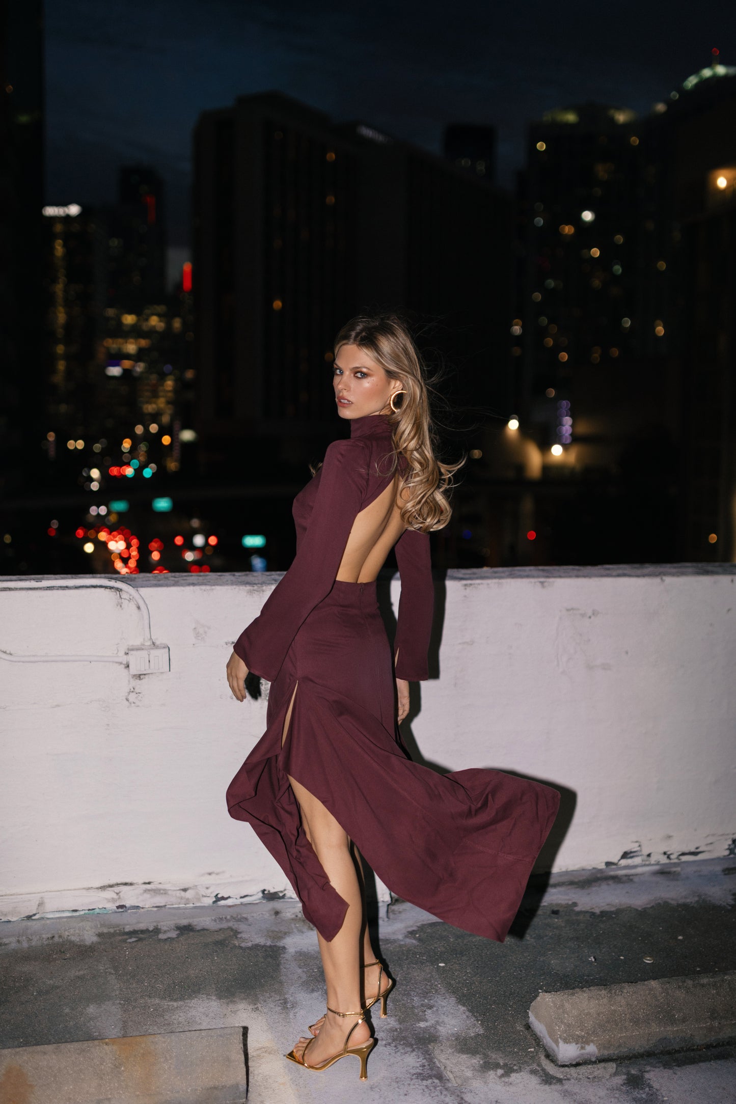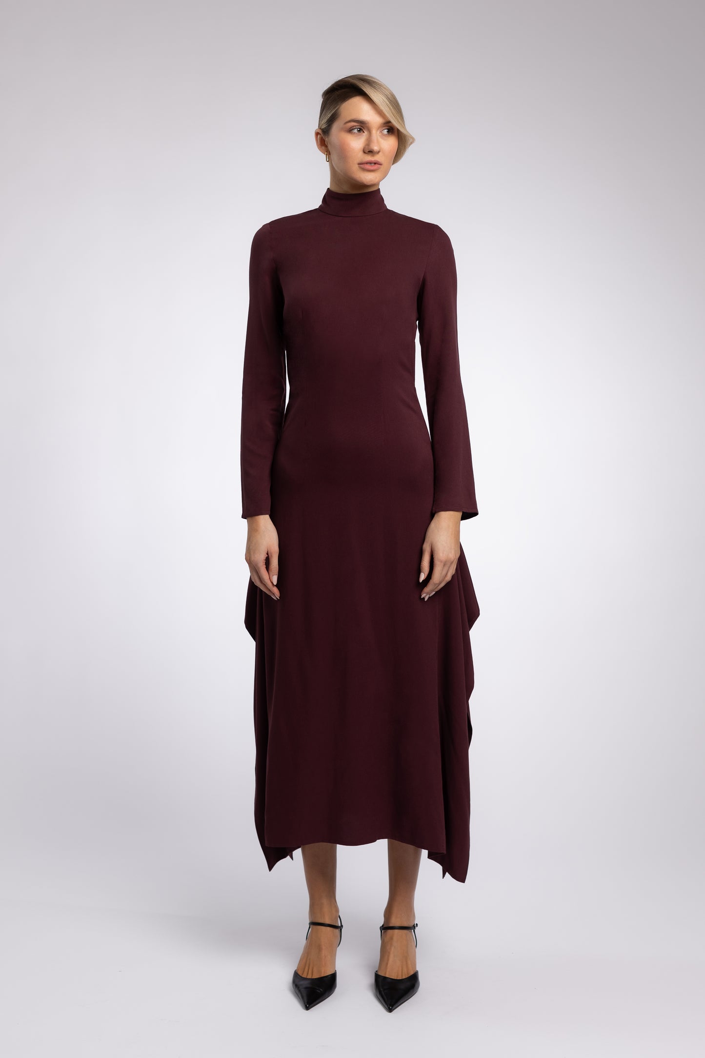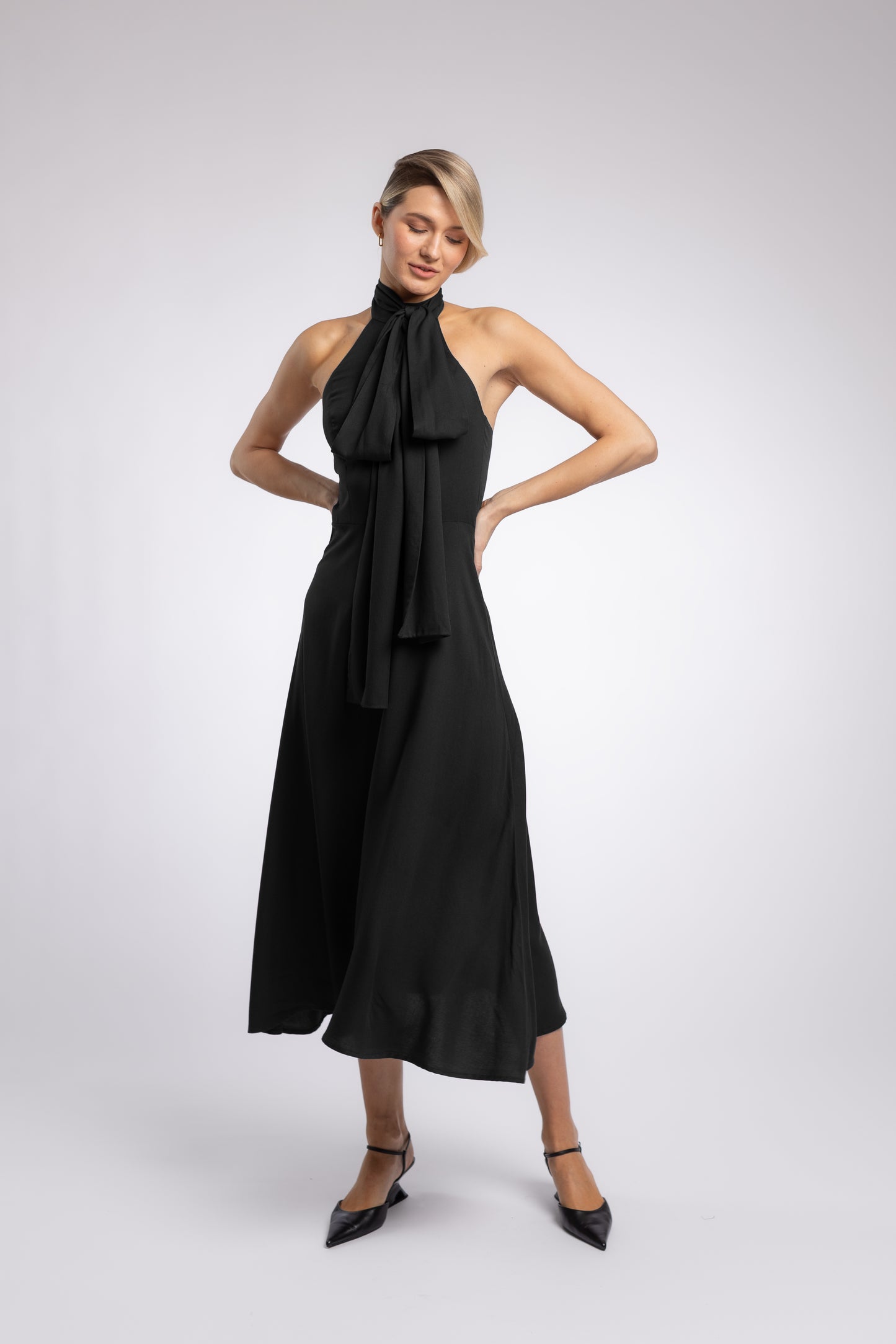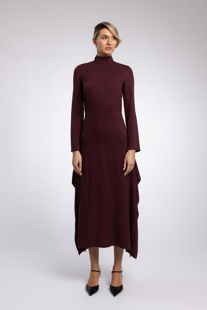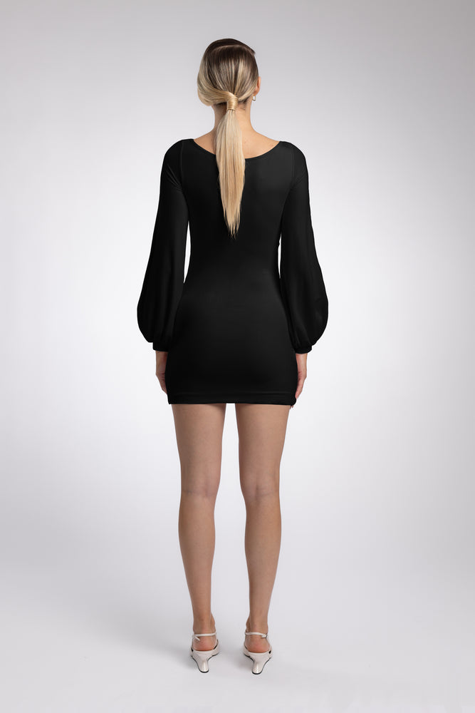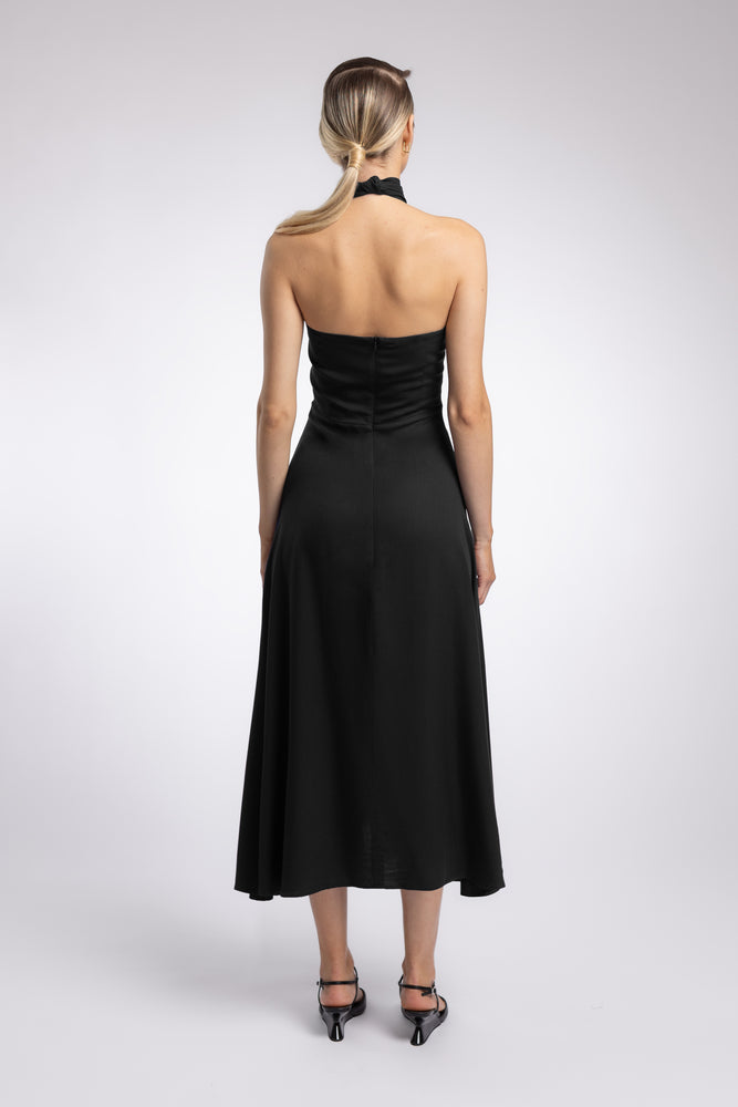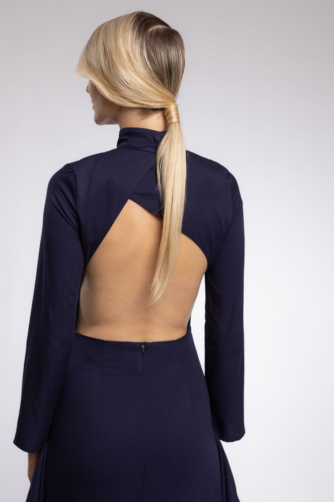 We want to offer you this dress with a promise: “Wear PERISSA and you will not be forgotten!”PERISSA is not your usual black dress: the high neckline statuesque silhouette, the daring side splits and the revealing open back are all together a very charming mix. Wear yours with high heels for a show-stopping effect: sandals, platform pumps or platform clogs.